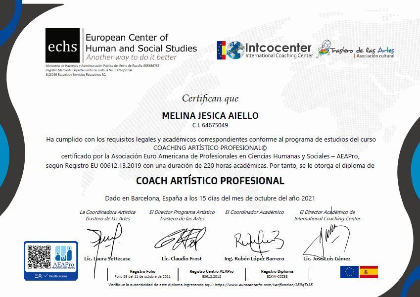 Esta certificación digital es un documento oficial de European Center of Human and Social Studies – echs. Los datos aquí contenidos han sido verificados y autorizados por el área de Certificaciones y Egresos adscrita a la Secretaría Académica de echs.